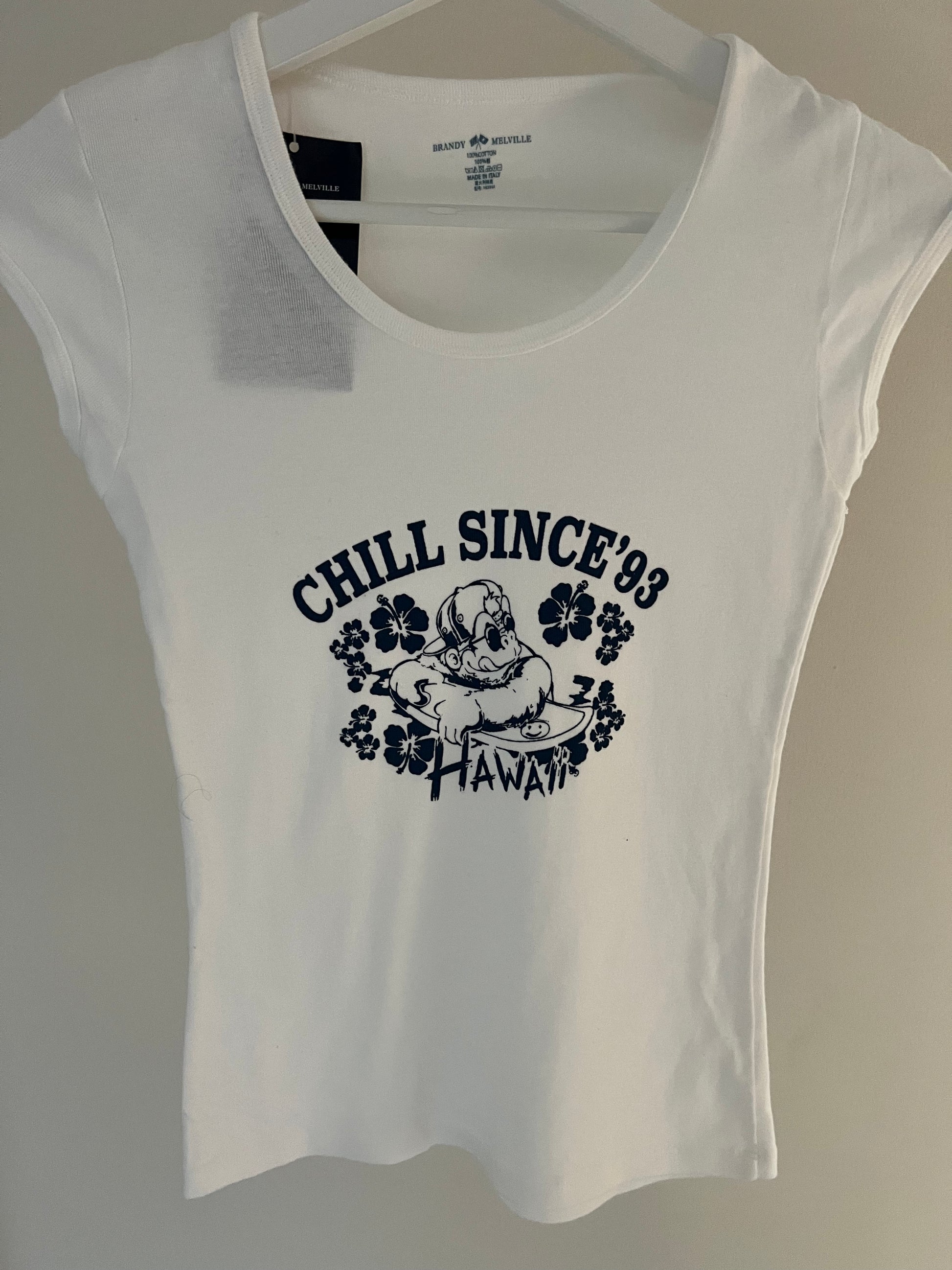 Soft, lightweight tee in white with navy Chill Since Hawaii text printed on the chest. Style 2 of the Hawaii Chill Since '93 Top. Style 1, has a more fitted style and shorter sleeves.