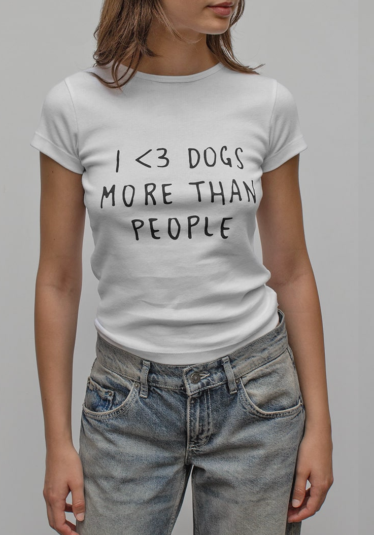 T-shirt with I love dogs more than people print, white, crew neckline, short sleeves, regular length, relaxed fit