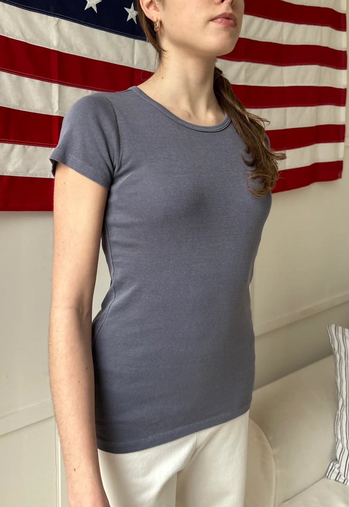 Fitted short sleeved shirt with a crew neck. In berry blue.