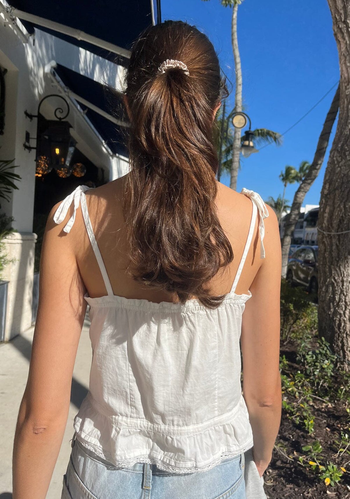 Button Up tank top with adjustable tie straps, lace detailing and trimming, and adjustable tie at waist.