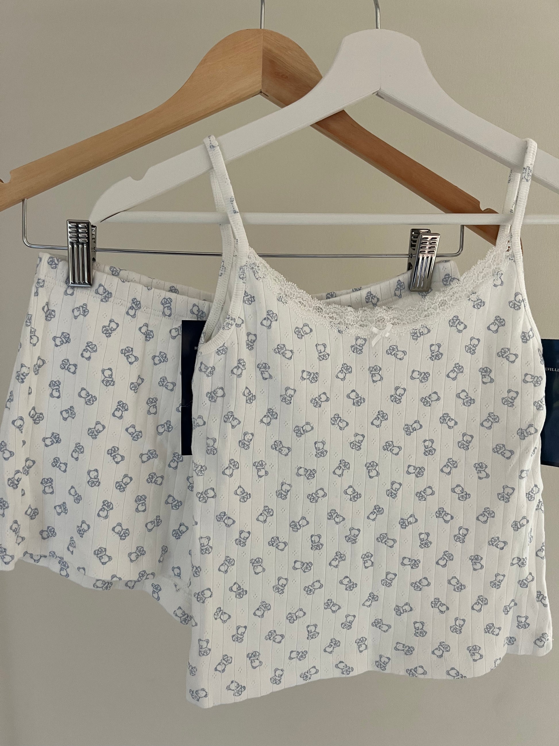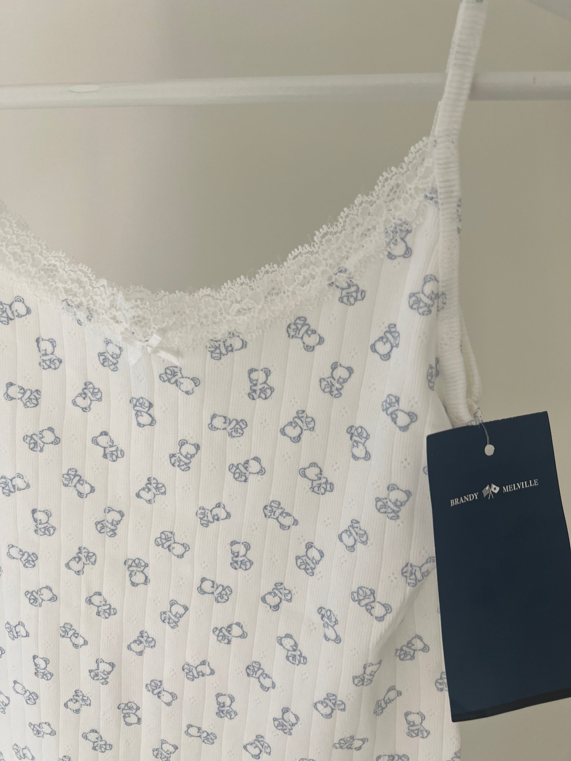 Regular fit, eyelet tank top with light blue teddy bear print, with a white lace trim and bow.